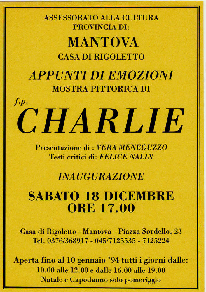 Personal exhibition of the painter Charlie, organized in the prestigiuos setting of Rigolettos house, in Sordellos Square, by the Education Councillorship of Mantua.