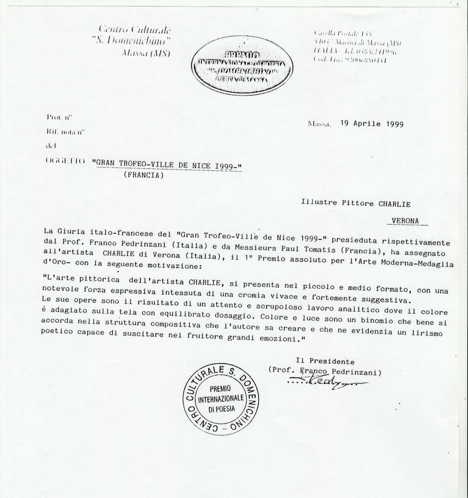 The Italian-French jury of the Gran trofèe Ville de Nice 1999" presided respectively by Professor Franco Pedrinzani (Italy) and by Messieurs Paul Tomatis (France), has awarded the artist Charlie from Verona (Italy), the 1° absolute Prize for Modern Art Golden Medal with the following reason: