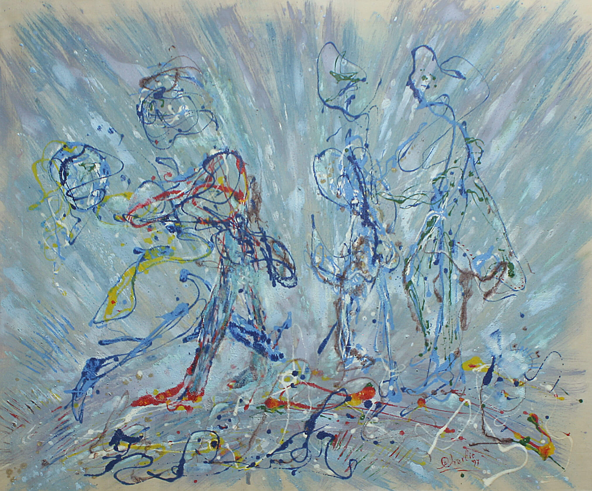 There is a reference to the informal gestural expressiveness of dripping: the dripping of the colour from the paintbrush which, suspended in the air,draws the stroke without touching the canvas. However, the resemblance is only apparent as the result is not a representational work: in fact we can clearly notice two couples, the one on the left is caught in a plastic attitude of a casché, while the other, more hesitating than the first is getting ready to dance.