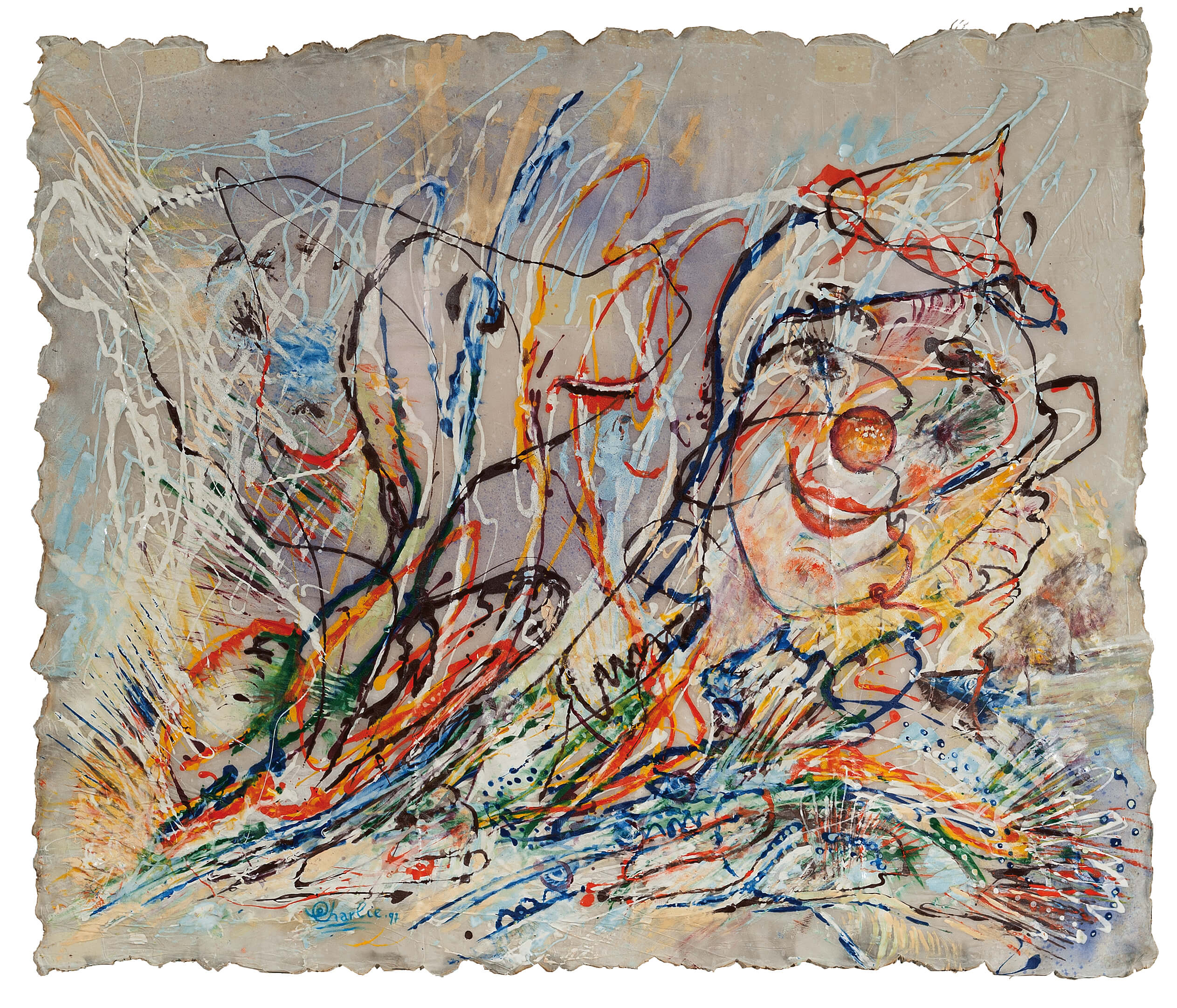 Anecdotal painting whose comical short story goes by our eyes and asks for our participation in order to take form: the protagonist, the unlikely ducksÂ’ tamer stands out with his big clown nose, but the gaze is invited to follow the path, given by stylized lines to know what will happen then: in fact some strange figures will be seen emerging from that path.