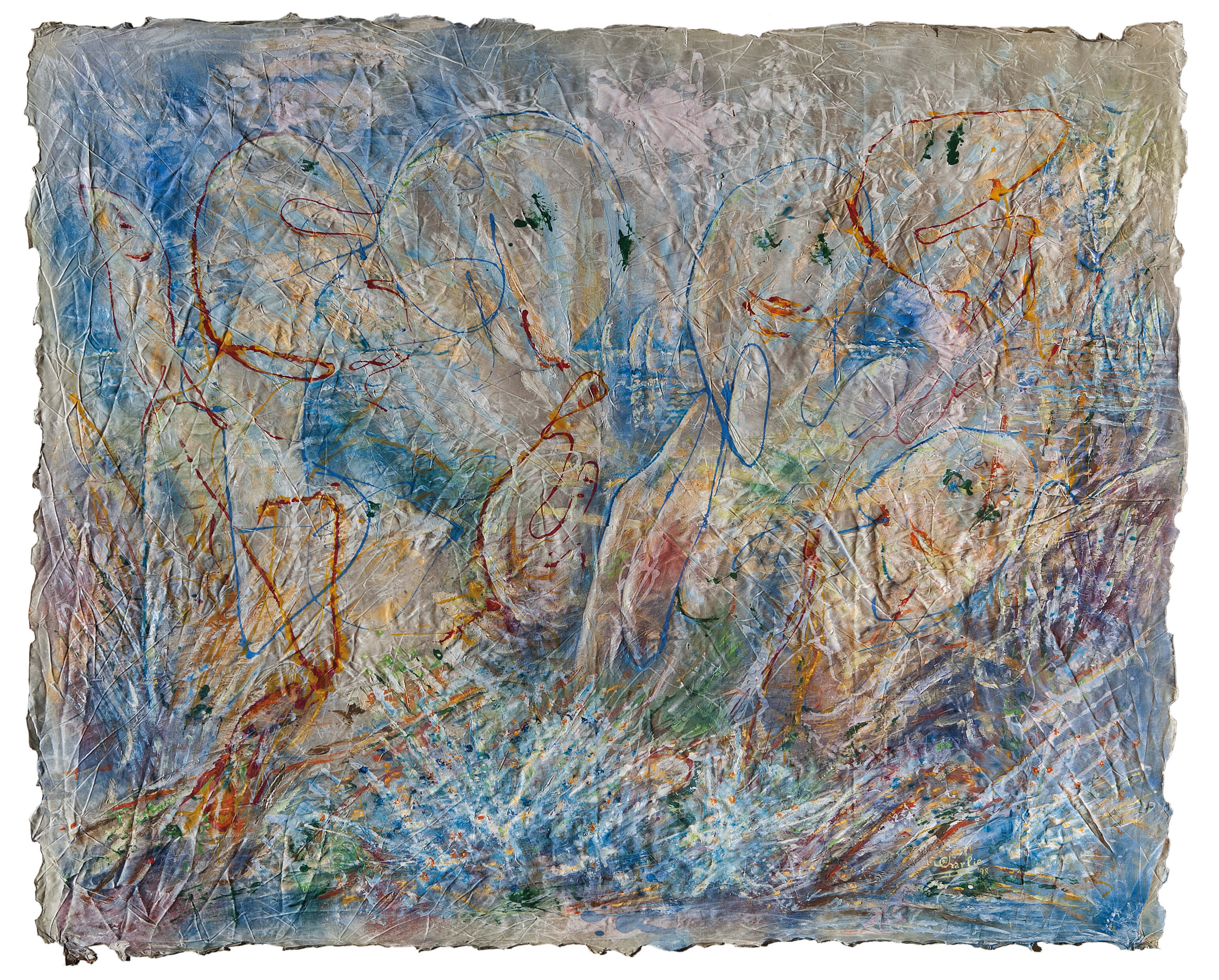 The reminescent classical subject of female bath in the open air is reinterpreted in a very original way. The seductive aspect - not completely absent here-does not derive from the common voluptuosness of naked bodies, but from the sinuosity of water itself, populated by inaccessible presences:water nymphs whose body is part of the element from which they are emerging and to which they will keep on mingling like waves.
