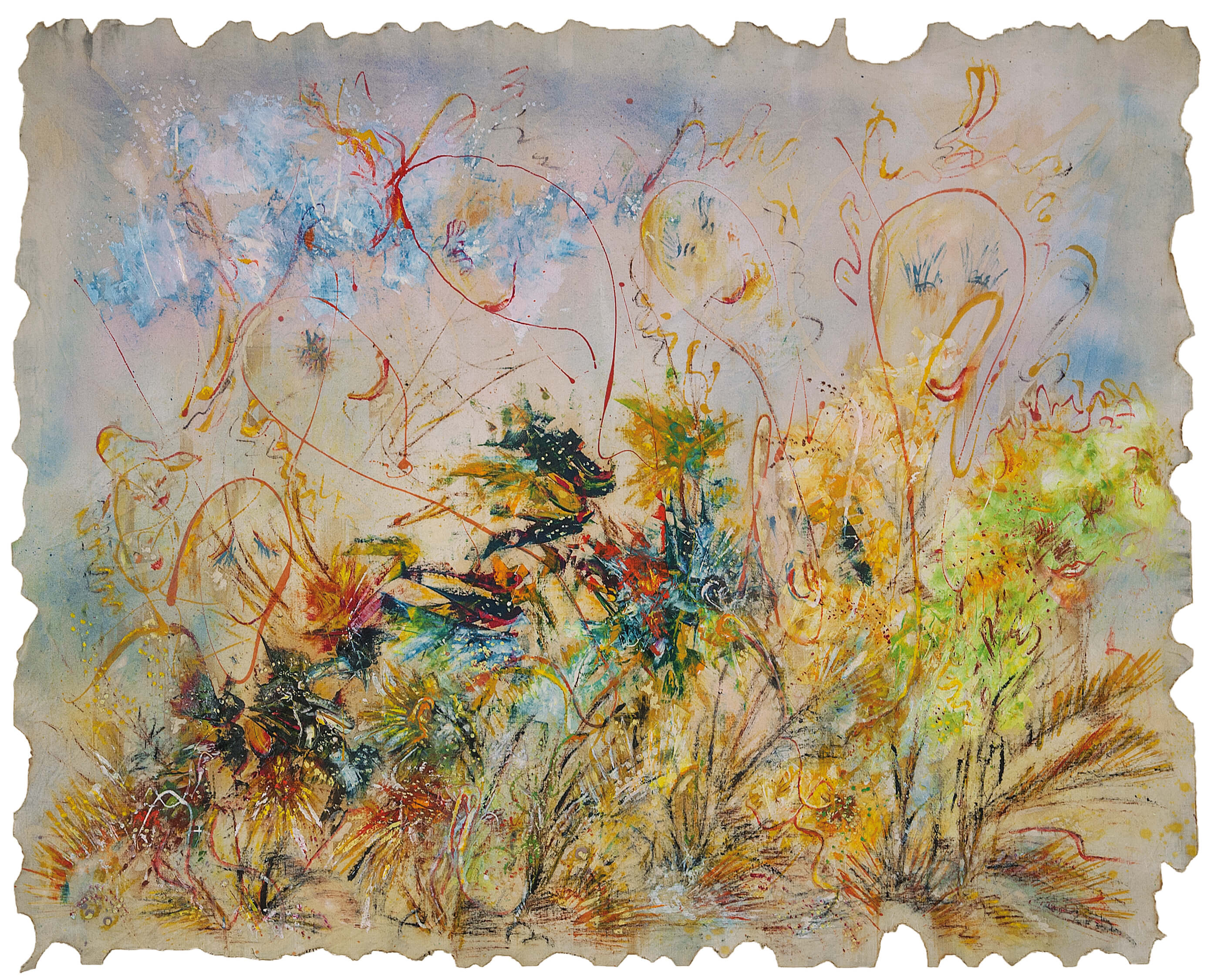 The ghostly nature of the presences which, once deprived of the heaviness of bodies,emerge from the branches in close-up, does not totally disregard the sensory aspect. The work hints at the erotic dimension with delicate refinement through the wild luxuriant stroke representing the vegetation, similar to a jungle.