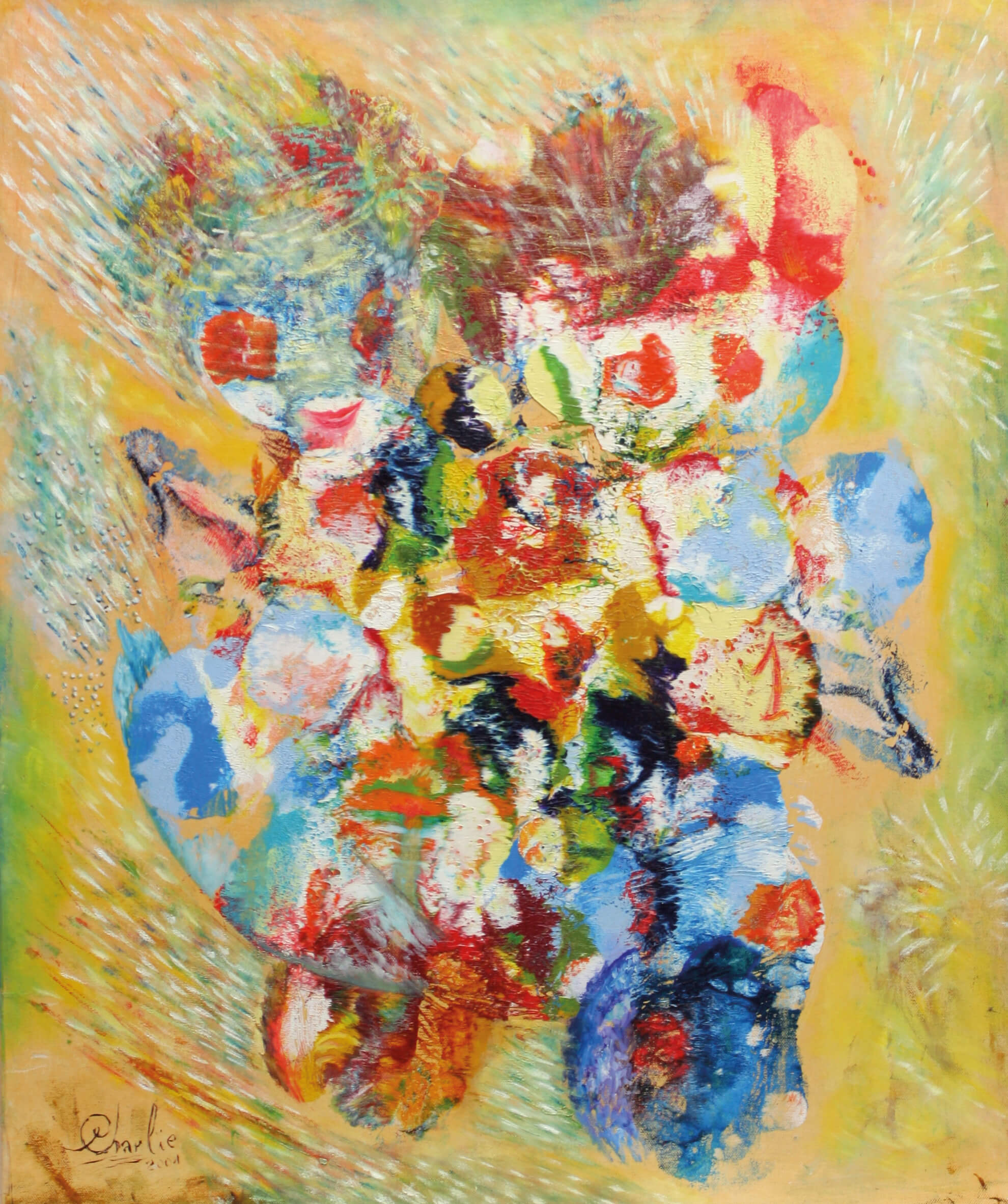 Title and subject of futurist inspiration which enhance the sensory thrill conveyed by speed, as the number one put on the front of the motorbike and the daring acting of the two shizzing motorcyclists reveal. In fact the man has an unfastened helmet and the girl is wearing loose hair.The frenetic dymanism of this aerodynamic motion splits the matter into many-sided polychromatic pieces which, together with the masked faces, contribute to evoke a Carnival atmosphere.