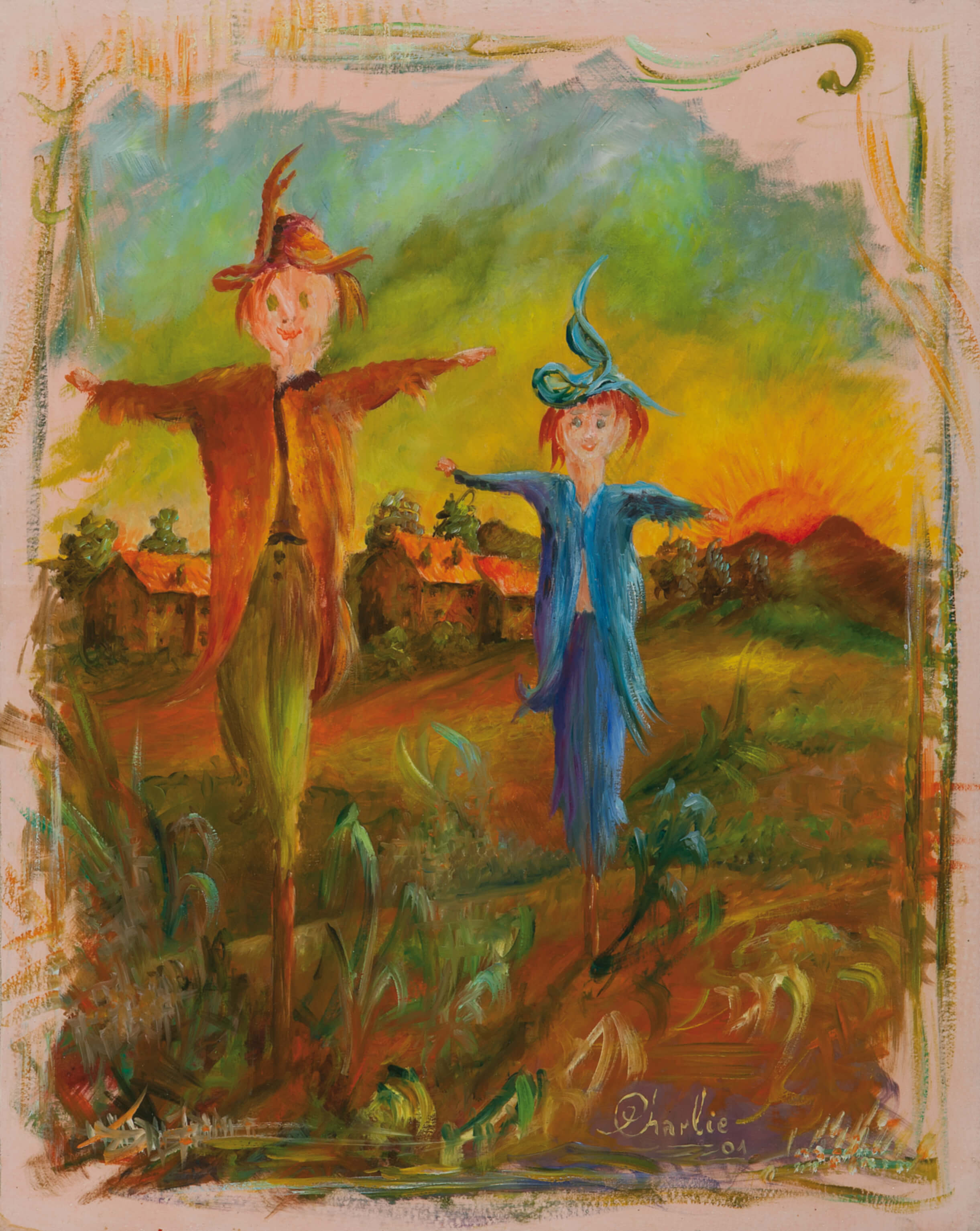 The sun disappearing below the horizon, behind the mountains, the red light of the sunset reflected on the housesÂ’ roofs, the humanized aspect of the scarecrows in the peace of the dusk and the ornamental design delimiting the landscape give this work the poetic sweetness typical of the fairy tales illustrations. The picture becomes the entry door towards a magic dimension announcing dream.