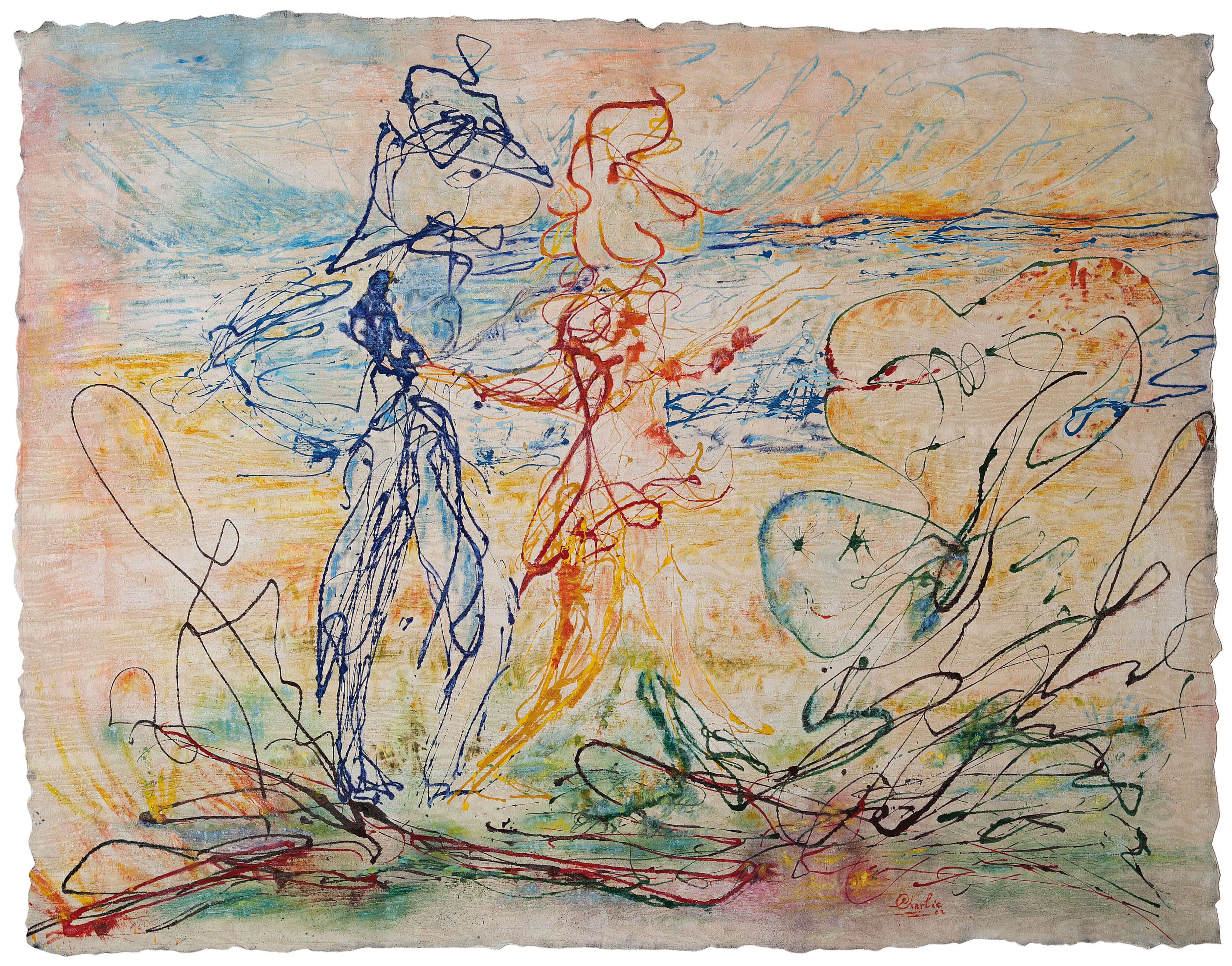 A man and a woman are romantically walking on the beach, their bodies are electromagnetic fluxes in harmony with the natural elements in which they are immersed to symbolize their union . He is made of the same matter of the sea passing through him against the light, she has the burning colours of the sun which, setting behind them, plunges into the water dying it with warm reflections.