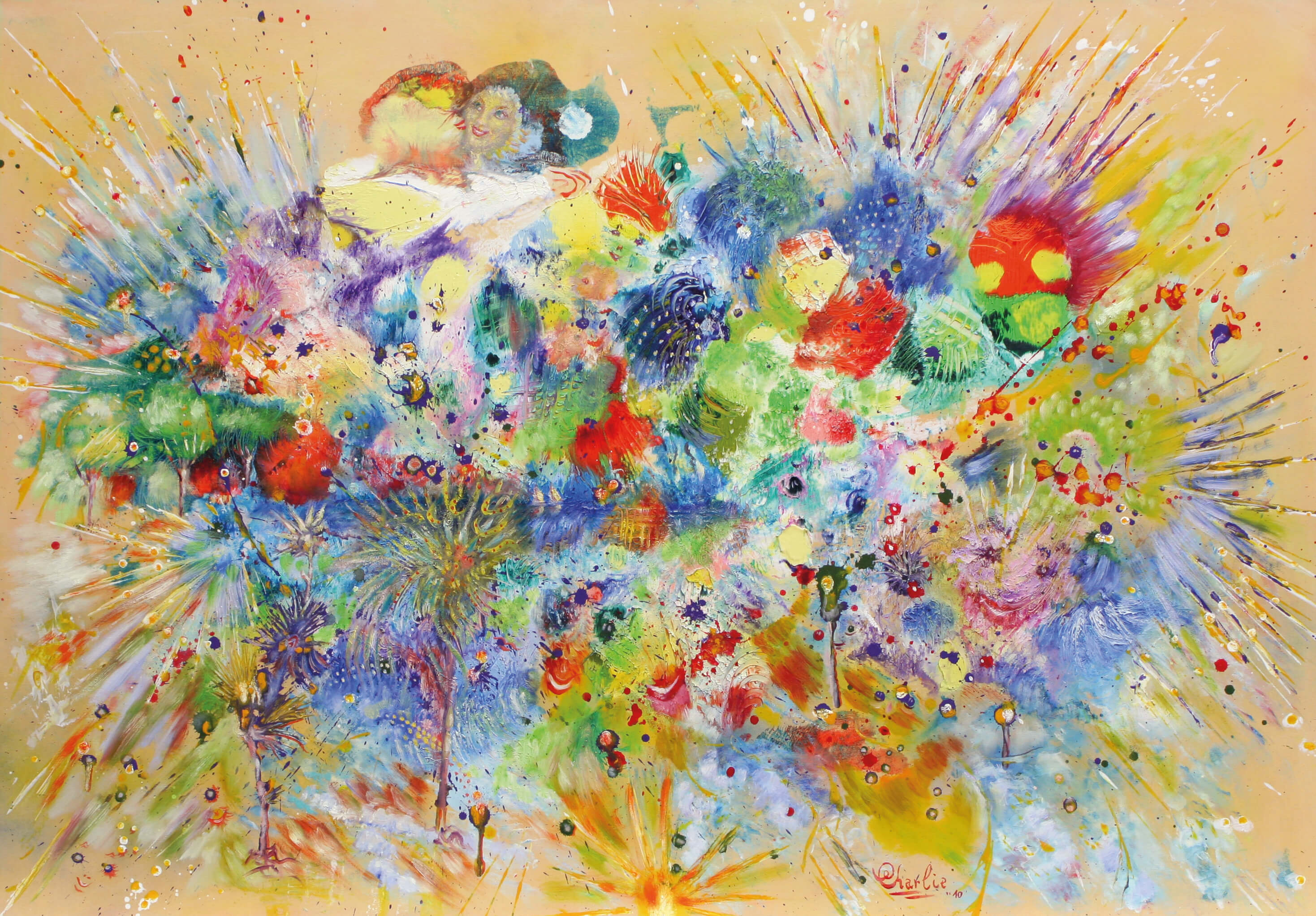 The picture shows a playful idea of love that conveys a sensation of lightness and joy: it quotes the famous KlimtÂ’s painting, but here it is reinterpreted in an explosion of firewoks, a kaleidoscopic riot of bright colour from which it is possible to discern jubilant indistinct presencesÂ’ faces.